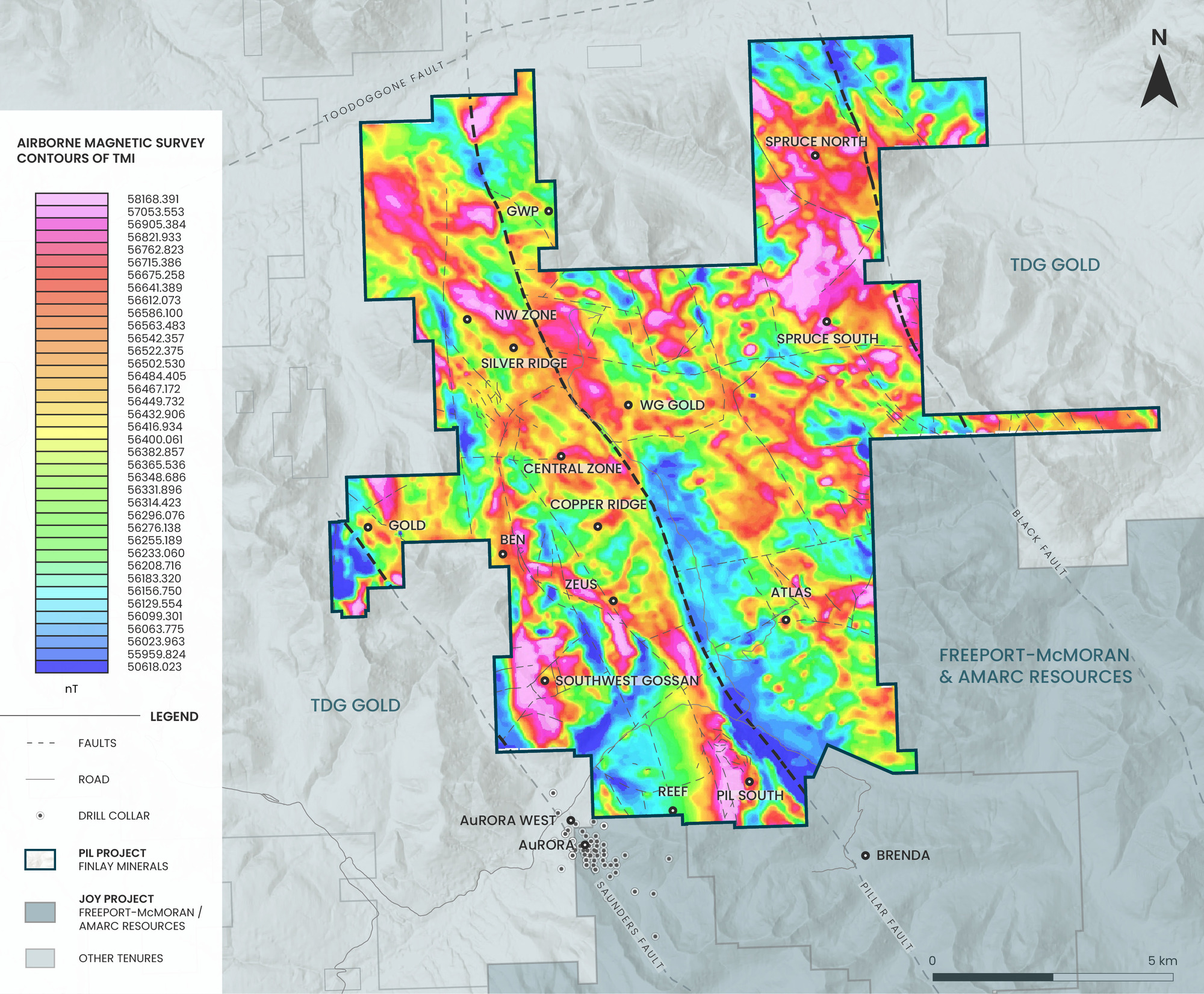The 2025 exploration program targeted the Reef, PIL South, Gold, Copper Ridge, Zeus, and Spruce areas of the PIL. It involved collecting 381 rock samples, 1,494 soil samples, and 561 SWIR data points (Refer to Figure 1). In addition, 46 line-kilometers of Induced Polarization and a 1,533 line-kilometer Airborne Magnetic Survey across the entire property were completed. The Airborne Magnetic survey identified significant and multiple northwest-trending structures such as the Saunders and Pillar faults (Refer to Figure 2). Between these major northwest structures are dilational zones with coincident geochemical and geophysical anomalies that could represent major targets for porphyry mineralization.
