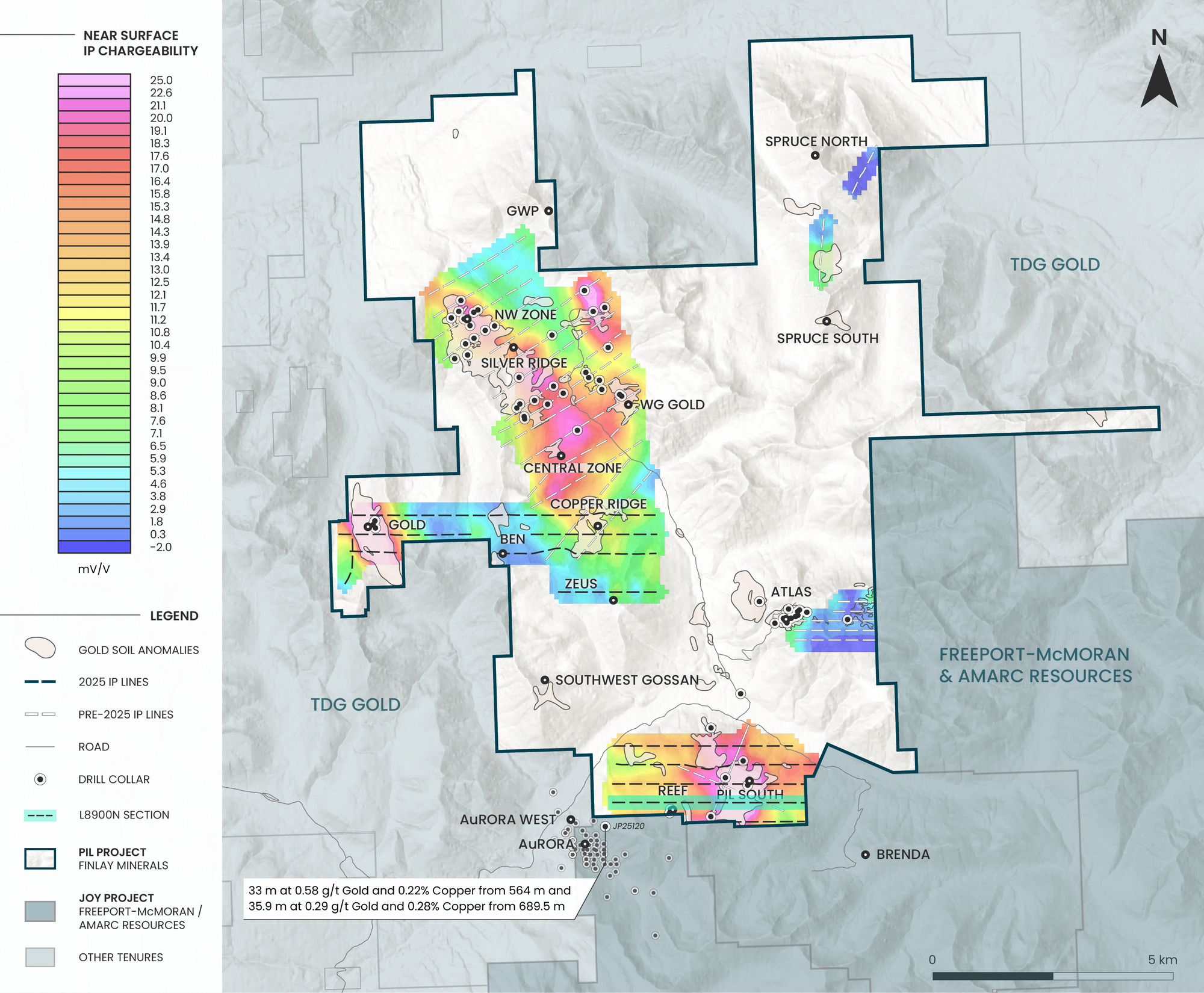 Figure 4: PIL Property 2025 IP Surveys with Gold Soil Geochemical Anomalies;