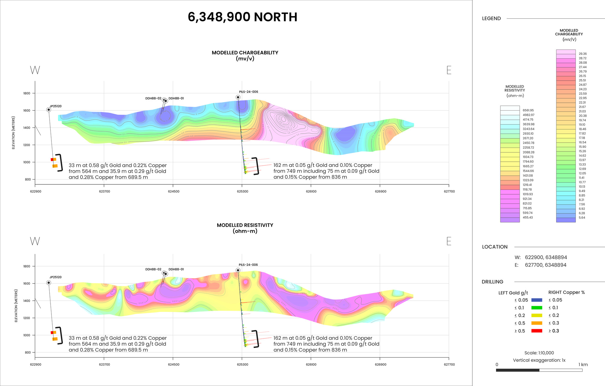 Figure 5: PIL Property 2025 IP Section 6,348,900N in relation to previous Reef & PIL South Drill Holes and AuRORA’s Drill Hole JP25120.