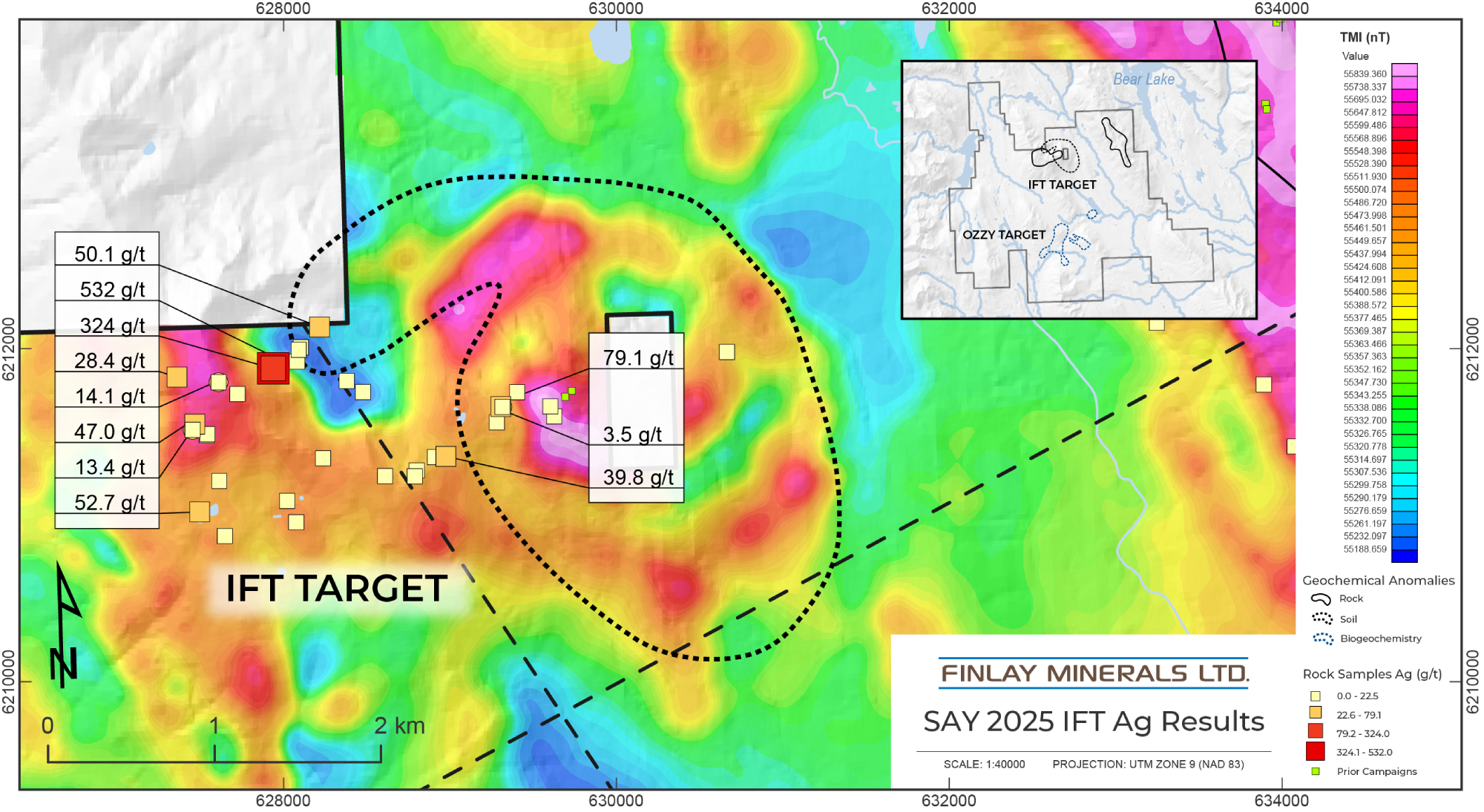 The 2025 exploration program, focused on the IFT and Ozzy targets with the collection of 80 rock, 292 soil, and 273 tree bark samples, in conjunction with geological mapping, to follow up on the targets generated by the Airborne Magnetic survey conducted in June.(1) The Airborne Magnetic survey identified significant and multiple northeast-trending structures. These structures resemble those found in the Toodoggone District of British Columbia, which is recognized for its potential to host larger porphyry and epithermal deposits. Sampling was focused on a 2,500 m x 2,500 m circular magnetic anomaly at the IFT porphyry target and the intersection of kilometer-scale, northeast- and northwest- trending magnetic anomalies at the Ozzy target. The IFT is located 4.5 km west of the high-grade Cu + Ag AG and East Breccia Zones delineated in 2024. The AG Target was outlined as a 200 m x 200 m high-grade Cu + Ag mineralized zone; the East Breccia assayed 1.17% Cu and 103.5 g/t Ag across 21.7m length of continuous chip sampling. (2)