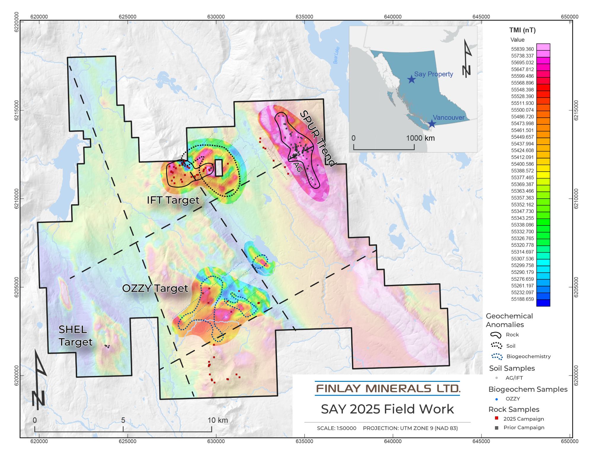 Refer to Figure 1 – SAY Property Targets and 2025 Surface Sample Locations underlain by Airborne Magnetics.