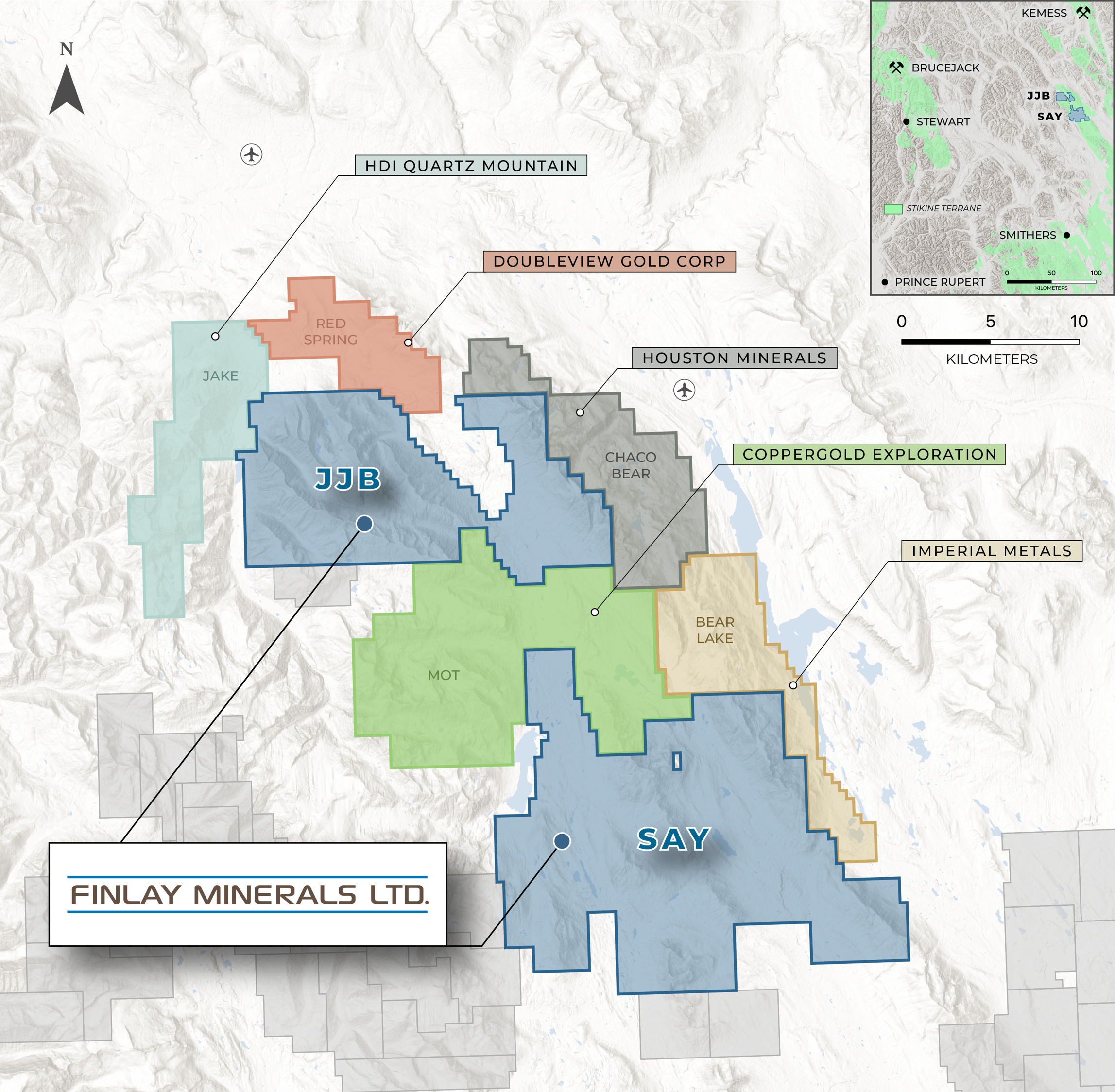 Finlay’s 100%-owned JJB Property covers 15,453 hectares (154 km2) of highly prospective Stikine Terrane, 150 km north of Smithers B.C, and 4 km north of the SAY Property claim boundary. The Stikine Terrane is a tectonic assemblage that hosts the metal endowment in B.C.’s Golden Triangle, the Toodoggone District, and the Skeena Arch. The JJB Property straddles the western margin of the relatively underexplored, 135-km-long, “Driftwood Corridor” of Stikinia, a tectonic position analogous to American Eagle Gold’s Nak Cu-Mo ± Ag ± Au porphyry prospect, 95 km to the south. The Driftwood Corridor hosts several volcanic redbed / sediment-hosted Cu ± Ag showings and prospects including the Copperline and Red Spring prospects. Porphyry prospects throughout the region are associated with post-accretionary Cretaceous – Eocene intrusions in both Stikinia (e.g. Imperial Metal’s Cu-Mo Porphyry Bear Lake Project) and overlying Bowser Basin sediments to the west (e.g. HDI Quartz Mountain’s Cu Porphyry Jake Project).